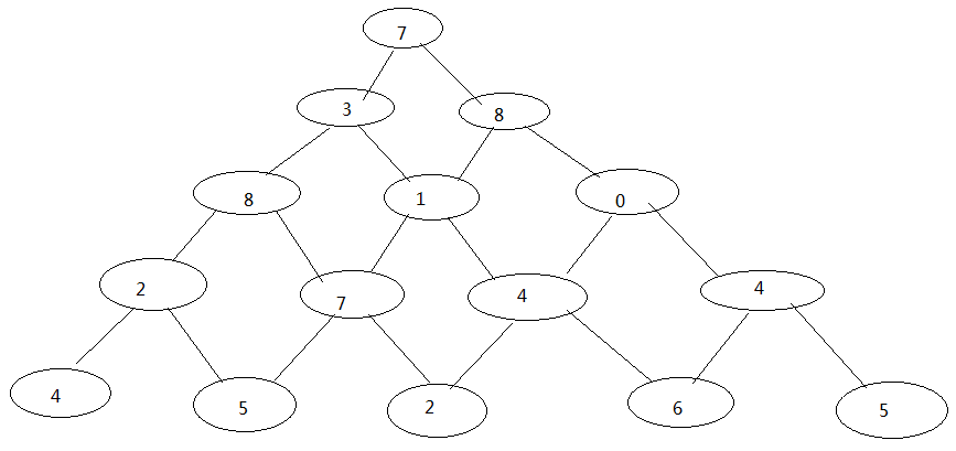 有如下所示的数塔,要求从底层走到顶层,若每一步只能走到相邻的结点,则经过的结点的数字之和最大是多少?