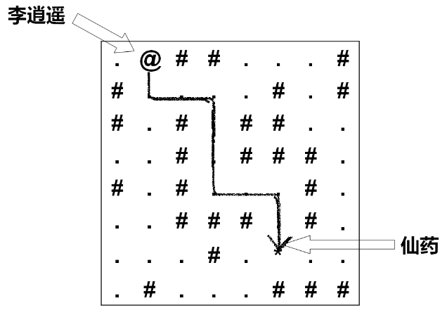 下图 显示了一个迷阵的样例及李逍遥找到仙药的路线。