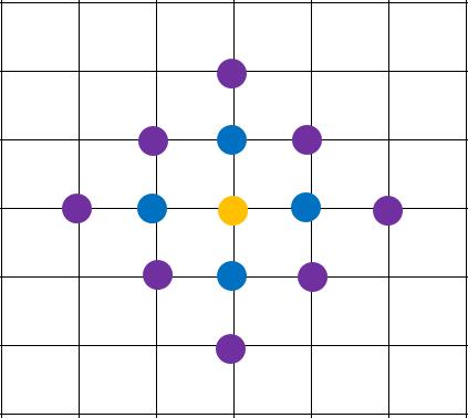 图形中有多个不同的图案,同一个图案的定义是这样的,对于两个发光的点,如果他们的曼哈顿距离(对于 A(x_1,y_1) 和 B(x_2,y_2) ,A 和 B 之间的曼哈顿距离为 |x_1-x_2|+|y_1-y_2| )小于等于 2 ,那么这两个点就属于一个图案。