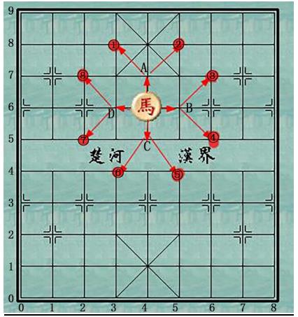 “马走日”的行棋有条规定:马先沿直线走一格,然后再沿斜线走一格。马每次跳一个“日”字,就是从“日”字的一个角走到其对角,不管这个“日”字是立着还是横着,只要没有被蹩住脚,它都可以跳过去。
