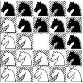在一个 5×5 的棋盘上有 12 个白色的骑士和 12 个黑色的骑士,且有一个空位。
