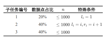 对于全部数据,保证有 1 \le n \le 1000 ,1 \le l_i \le r_i \le 10^5 ,1 \le h_i \le 10^5 。