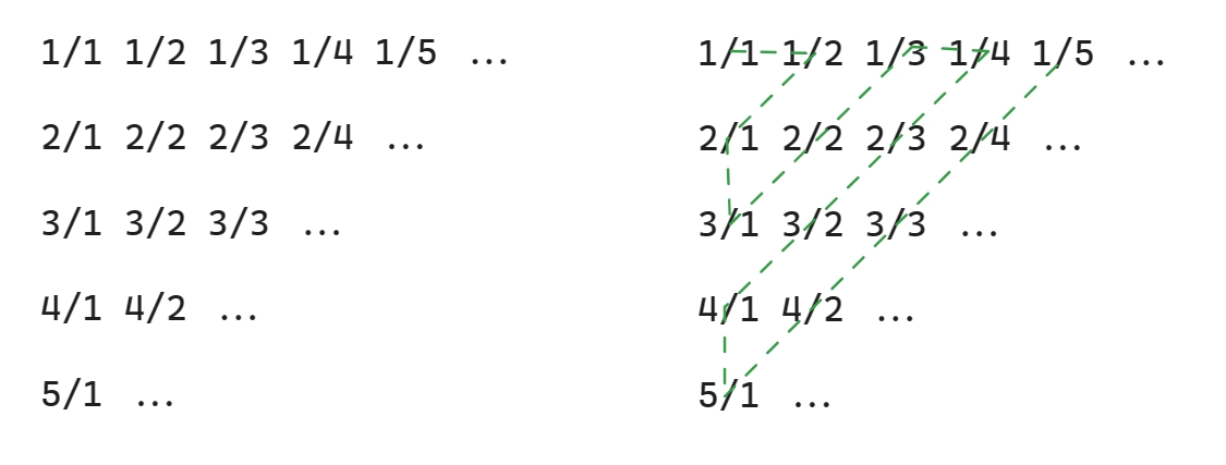 如果以 “之” 字形给上图的每一项编号(请注意观察上图中绿色虚线标记的路径)。第 1 项是 1/1,然后是1/2,2/1,3/1,2/2,...